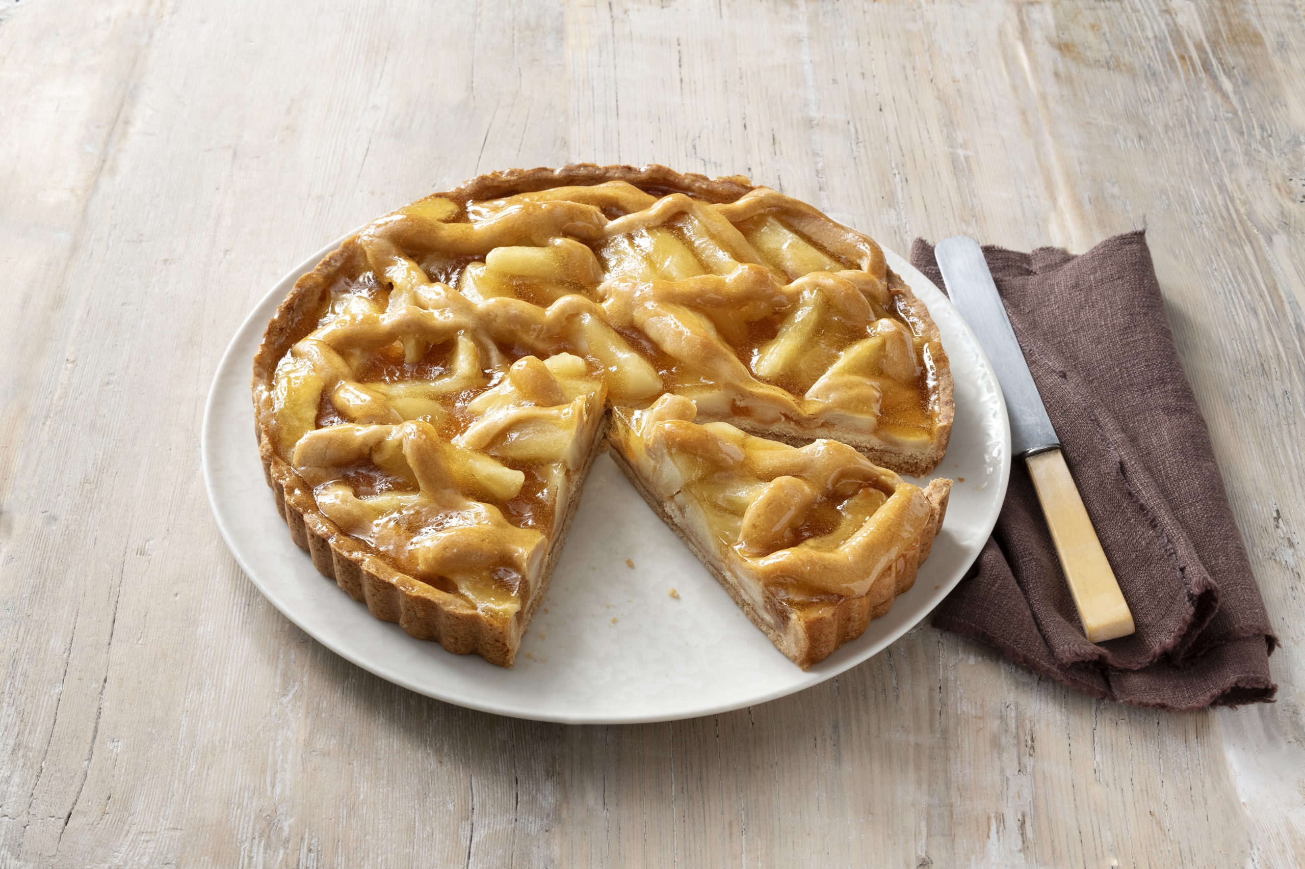 Short pastry base filled with sliced apples and glaze, decorated with a lattice of short pastry strips