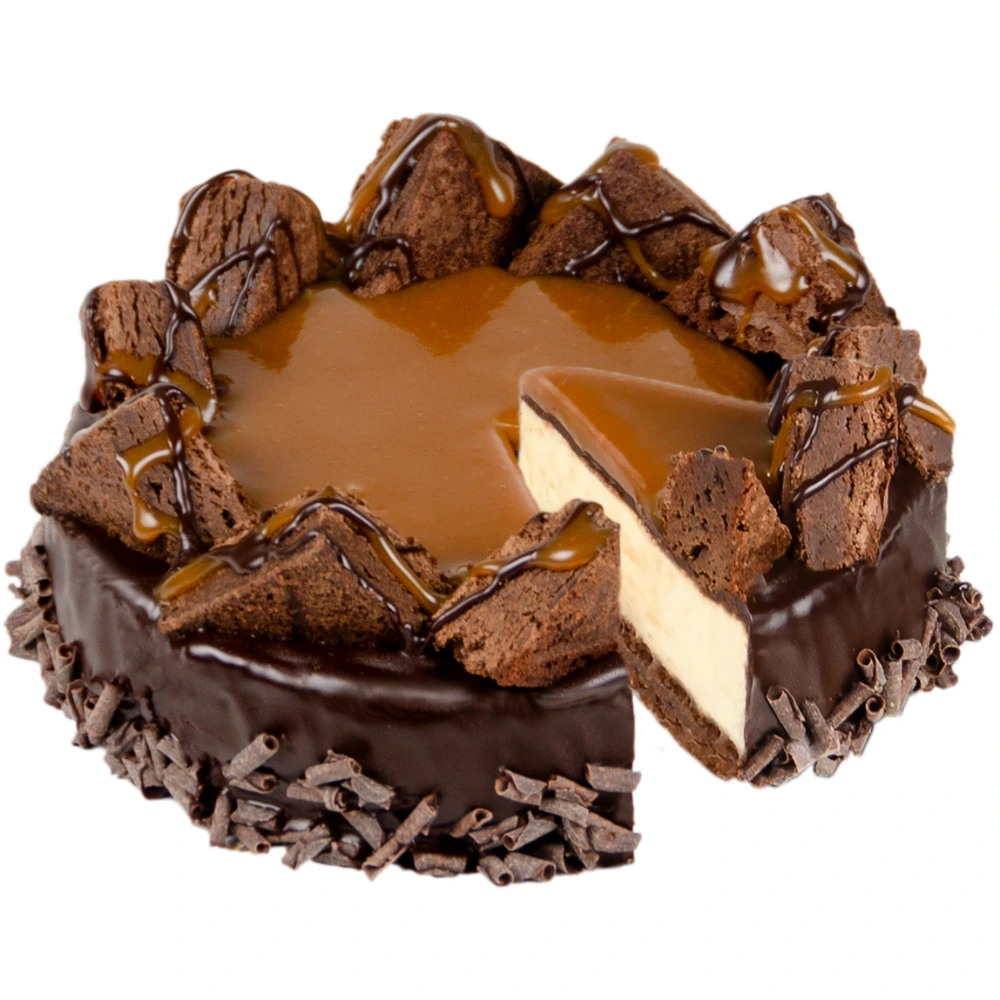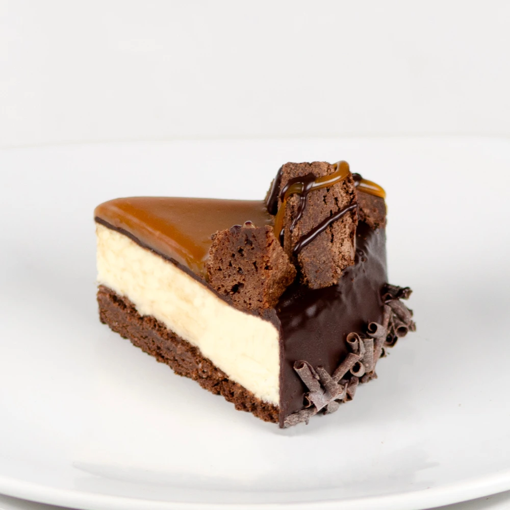 A rich brownie base baked with a creamy vanilla cheesecake. Adorned with dark chocolate ganache, our homemade brownies and a scrumptious pool of buttery caramel