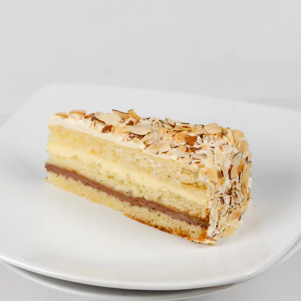 A triple layer of delicious rum-infused vanilla cake layered with chocolate and vanilla custard, covered in rum frosting, with toasted almonds.